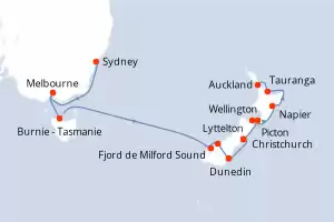 Itinéraire : Sydney, Melbourne, Burnie - Tasmanie, Fjord de Milford Sound, Parc national de Fiordland, Dunedin, Lyttelton, Christchurch, Wellington, Picton, Napier, Tauranga, Auckland