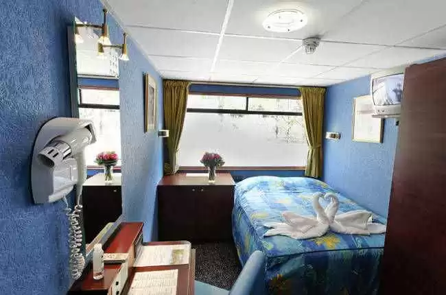 Les cabines du pont principal sont dotées d’une fenêtre haute tandis que celles du pont supérieur dispose de fenêtres panoramiques coulissantes donnant sur un balcon à la française.