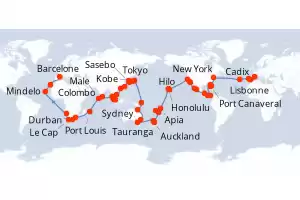 Itinéraire : Barcelone, Cadix, Lisbonne, Punta Delgada, New York, Port Canaveral, Port Everglade, Celebration Key, Colón - Panama, Puntarenas, Puerto Quetzal, Puerto Vallarta, Cabo san Lucas, San Diego, Los Angeles, San Francisco, Hilo, Honolulu, Apia, Suva, Nukualofa, Tauranga, Auckland, Baie des Iles, Melbourne, Sydney, Cairns, Rabaul, Tokyo, Shimizu, Kobe, Sasebo, Pusan, Keelung, Hong Kong, Phu My, Singapour, Port Klang, Penang, Langkawi, Phuket, Colombo, Male, Port Louis, Durban, Port Elisabeth, Le Cap, Walvis Bay, Mindelo, Las Palmas, Barcelone