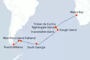 Antarctique, Afrique du Sud, Royaume-Uni, Îles Malouines, Chili Itinéraire: Puerto Williams , Puerto Williams , Puerto Williams , Puerto Williams , West Point Island Falkland , West Point Island Falkland , West Point Island Falkland , West Point Island Falkland , Port Stanley , Port Stanley , Port Stanley , Port Stanley , South Georgia , South Georgia , South Georgia , South Georgia , South Georgia , South Georgia , South Georgia , South Georgia , South Georgia , South Georgia , South Georgia , South Georgia , Gough Island , Gough Island , Gough Island , Gough Island , Nightingale Island , Nightingale Island , Nightingale Island , Nightingale Island , Tristan da Cunha , Tristan da Cunha , Tristan da Cunha , Tristan da Cunha , Inaccessible island , Inaccessible island , Inaccessible island , Inaccessible island , Le Cap , Le Cap , Le Cap , Le Cap , Le Cap , Le Cap , Le Cap , Le Cap Pension Complète Silver cloud Expedition 22 jours Suite Puerto Williams 06/03/2026 dès 16253 CHF Boissons incluses Cuisine Gastronomique Service de Majordome inclus Frais de séjour inclus Pension Complète Voir les offres