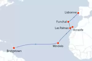Portugal,Espagne,Cap-Vert,Barbade Itinéraire: Lisbonne , Lisbonne , Funchal , Funchal , Funchal , Funchal , Santa Cruz de la Palma , Santa Cruz de la Palma , Santa Cruz de Tenerife , Santa Cruz de Tenerife , Mindelo , Mindelo , Bridgetown , Bridgetown Pension Complète Silver Ray 15 jours Suite Lisbonne 04/12/2027 dès 5453 CHF Boissons incluses Cuisine Gastronomique Service de Majordome inclus Frais de séjour inclus Pension Complète Voir les offres