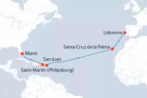Portugal,Espagne,Cap-Vert,Royaume-Uni,Porto Rico Itinéraire: Lisbonne , Lisbonne , Funchal , Funchal , Funchal , Funchal , Santa Cruz de la Palma , Santa Cruz de la Palma , Mindelo , Mindelo , Gustavia , Gustavia , San Juan , San Juan Pension Complète Silver Dawn 15 jours Suite Lisbonne 27/11/2027 dès 4928 CHF Boissons incluses Cuisine Gastronomique Service de Majordome inclus Frais de séjour inclus Pension Complète Voir les offres