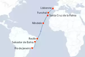 Brésil, Cap-Vert, Espagne, Portugal Itinéraire: Lisbonne , Lisbonne , Lisbonne , Lisbonne , Funchal , Funchal , Funchal , Funchal , Funchal , Funchal , Funchal , Funchal , Santa Cruz de la Palma , Santa Cruz de la Palma , Santa Cruz de la Palma , Santa Cruz de la Palma , Mindelo , Mindelo , Mindelo , Mindelo , Recife , Recife , Recife , Recife , Salvador de Bahia , Salvador de Bahia , Salvador de Bahia , Salvador de Bahia , Rio de Janeiro , Rio de Janeiro , Rio de Janeiro , Rio de Janeiro , Rio de Janeiro , Rio de Janeiro , Rio de Janeiro , Rio de Janeiro Pension Complète Silver Whisper 19 jours Suite Lisbonne 28/11/2025 dès 4247 CHF Boissons incluses Cuisine Gastronomique Service de Majordome inclus Frais de séjour inclus Pension Complète Voir les offres