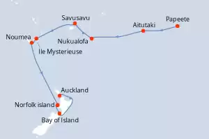 Fidji (Îles), Nouvelle-Calédonie, Tonga, Vanuatu, Îles Cook, France, Nouvelle-Zélande Itinéraire: Papeete , Papeete , Papeete , Papeete , Aitutaki , Aitutaki , Aitutaki , Aitutaki , Nukualofa , Nukualofa , Nukualofa , Nukualofa , Savusavu , Savusavu , Savusavu , Savusavu , Ile Mysterieuse , Ile Mysterieuse , Ile Mysterieuse , Ile Mysterieuse , Noumea , Noumea , Noumea , Noumea , Noumea , Noumea , Noumea , Noumea , Norfolk island , Norfolk island , Norfolk island , Norfolk island , Bay of Island , Bay of Island , Bay of Island , Bay of Island , Auckland , Auckland , Auckland , Auckland Pension Complète Silver Dawn 17 jours Suite Papeete 07/02/2026 dès 10853 CHF Boissons incluses Cuisine Gastronomique Service de Majordome inclus Frais de séjour inclus Pension Complète Voir les offres