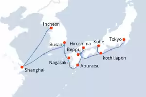 Japon,Corée du Sud,Chine Itinéraire: Tokyo , Kobe , Kobe , kochi , Beppu , Hiroshima , Aburatsu , Nagasaki , Busan , Shanghai , Shanghai , Shanghai , Incheon Pension Complète Silver Muse 16 jours Suite Tokyo 25/09/2027 dès 10696 CHF Boissons incluses Cuisine Gastronomique Service de Majordome inclus Frais de séjour inclus Pension Complète Voir les offres