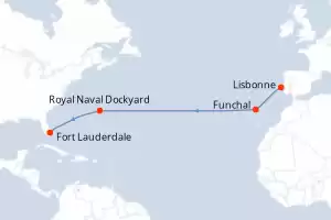 Portugal, Royaume-Uni, États-Unis Itinéraire: Lisbonne , Lisbonne , Lisbonne , Lisbonne , Funchal , Funchal , Funchal , Funchal , Royal Naval Dockyard , Royal Naval Dockyard , Royal Naval Dockyard , Royal Naval Dockyard , Royal Naval Dockyard , Royal Naval Dockyard , Royal Naval Dockyard , Royal Naval Dockyard , Fort Lauderdale , Fort Lauderdale , Fort Lauderdale , Fort Lauderdale Pension Complète Silver Ray 14 jours Suite Lisbonne 19/11/2025 dès 4771 CHF Boissons incluses Cuisine Gastronomique Service de Majordome inclus Frais de séjour inclus Pension Complète Voir les offres