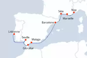 France, Espagne, Royaume-Uni, Portugal Itinéraire: Lisbonne , Lisbonne , Lisbonne , Lisbonne , Seville , Seville , Seville , Seville , Seville , Seville , Seville , Seville , Gibraltar , Gibraltar , Gibraltar , Gibraltar , Malaga , Malaga , Malaga , Malaga , Barcelone , Barcelone , Barcelone , Barcelone , Sète , Sète , Sète , Sète , Marseille , Marseille , Marseille , Marseille , Nice , Nice , Nice , Nice Pension Complète Silver shadow 11 jours Suite Lisbonne 17/03/2026 dès 3827 CHF Boissons incluses Cuisine Gastronomique Service de Majordome inclus Frais de séjour inclus Pension Complète Voir les offres