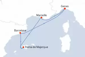 France, Italie, Espagne, Baléares Itinéraire: Marseille , Genes , Barcelone , Barcelone , Palma de Majorque , Marseille Pension Complète Costa Toscana 6 jours Cabine standard Marseille 15/02/2026 dès 314 CHF Offre train A/R dès 99€ Enfants Gratuits jusqu'à 18 ans Club Enfants dès 3 ans Pension Complète Autres ports d'embarquement : Genes Voir les offres
