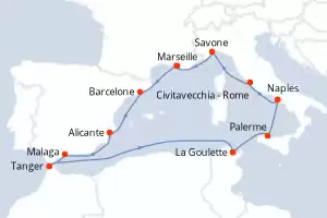 France, Espagne, Maroc, Tunisie, Italie Itinéraire: Marseille , Barcelone , Alicante , Malaga , Tanger , La Goulette , Palerme , Naples , Civitavecchia - Rome , Savone , Marseille Pension Complète Costa Toscana 13 jours Cabine standard Marseille 03/01/2026 dès 859 CHF Offre train A/R dès 99€ Enfants Gratuits jusqu'à 18 ans Club Enfants dès 3 ans Pension Complète Autres ports d'embarquement : Barcelone Savone Voir les offres