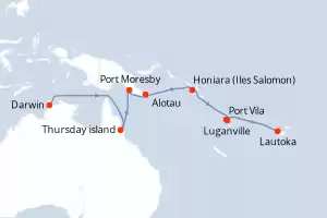 Escapade au c½ur de la Mélanésie Itinéraire: Darwin , Thursday island , Port Moresby , Alotau , Honiara (Iles Salomon) , Luganville , Port Vila , Lautoka Pension Complète Le Jacques Cartier 17 jours Cabine balcon Darwin 21/08/2026 dès 10811 CHF Luxe Francophone Service Majordome inclus Boissons incluses Gastronomie Ducasse Conseil Pension Complète Voir les offres