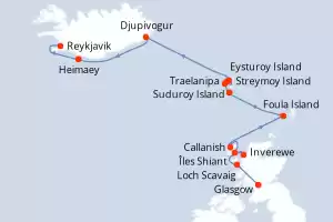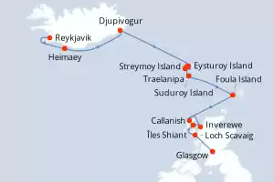 Archipels sauvages de l?Atlantique Nord Itinéraire: Reykjavik , Heimaey , Djupivogur , Eysturoy Island , Streymoy Island , Traelanipa , Streymoy Island , Suduroy Island , Foula Island , Callanish , Inverewe , Îles Shiant , LOCH SCAVAIG , Glasgow Pension Complète L Austral 12 jours Cabine extérieure Reykjavik 18/06/2027 dès 9207 CHF Luxe Francophone Service Majordome inclus Boissons incluses Gastronomie Ducasse Conseil Pension Complète Voir les offres