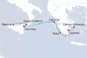 De la Sicile aux îles grecques, sous les voiles du Ponant Itinéraire: Palerme , Reggio Calabria , Taormine , Fiskardo , Pylos , Spetses , Lavrion (Athenes) Pension Complète Le Ponant 8 jours Cabine extérieure Palerme 08/06/2027 dès 8640 CHF Luxe Francophone Service Majordome inclus Boissons incluses Gastronomie Ducasse Conseil Pension Complète Voir les offres