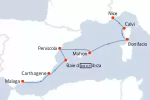 Île de Beauté et rivages ibériques Itinéraire: Nice , Calvi , Bonifacio , Mahon , Peniscola , Baie d’ibiza , Carthagene , Malaga Pension Complète Le Boreal 8 jours Cabine extérieure Nice 23/06/2027 dès 4152 CHF Luxe Francophone Service Majordome inclus Boissons incluses Gastronomie Ducasse Conseil Pension Complète Voir les offres