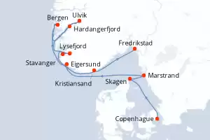 Scandinavie confidentielle Itinéraire: Copenhague , Skagen , Marstrand , Eigersund , Bergen , Hardangerfjord , Ulvik , Lysefjord , Stavanger , Kristiansand , Fredrikstad Pension Complète Le Champlain 9 jours Cabine balcon Copenhague 12/08/2027 dès 7026 CHF Luxe Francophone Service Majordome inclus Boissons incluses Gastronomie Ducasse Conseil Pension Complète Voir les offres