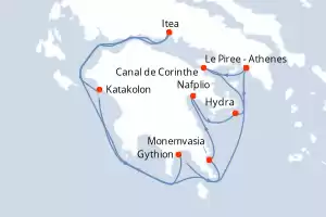 Paysages et sites emblématiques du Péloponnèse Itinéraire: Le Piree - Athenes , Canal de Corinthe , Itea , Katakolon , Gythion , Monemvasia , Nafplio , Hydra , Le Piree - Athenes Pension Complète Le Champlain 8 jours Cabine balcon Le Piree - Athenes 25/10/2026 dès 5065 CHF Luxe Francophone Service Majordome inclus Boissons incluses Gastronomie Ducasse Conseil Pension Complète Voir les offres
