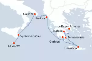 Cités antiques de Méditerranée Itinéraire: Le Piree - Athenes , Nafplio , Monemvasia , Gythion , Kerkira , Gallipoli , Syracuse (Sicile) , La Valette Pension Complète Le Dumont d Urville 8 jours Cabine balcon Le Piree - Athenes 22/10/2026 dès 5358 CHF Luxe Francophone Service Majordome inclus Boissons incluses Gastronomie Ducasse Conseil Pension Complète Voir les offres
