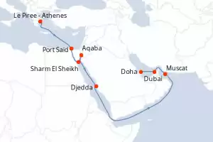 Grèce,Egypte,Jordanie,Arabie Saoudite,Oman,Emirats Arabes Unis,Qatar Itinéraire: Le Piree - Athenes , Port Said , Sharm El Sheikh , Aqaba , Djedda , Muscat , Dubai , Doha Pension Complète Celestyal Journey 15 jours Cabine standard Le Piree - Athenes 14/11/2026 dès 1247 CHF Pourboires inclus Boissons incluses aux repas Pension Complète Voir les offres