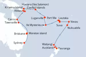 Australie, Nouvelle-Zélande, Tonga, Fidji (Îles), Papouasie-Nouvelle-Guinée, Vanuatu Itinéraire: Sydney , Moreton island , Brisbane , Townsville , Cairns , Alotau , Conflict Islands , Kiriwina Island , Honiara (Iles Salomon) , Luganville , Port Vila , Ile Mysterieuse , Lautoka , Suva , Dravuni Island , Vavau , Nukualofa , Waitangi , Tauranga , Auckland Pension Complète Noordam 29 jours Cabine standard Sydney 04/01/2026 dès 3923 CHF Cuisine Raffinée Expérience Premium Animations à bord exclusives Pension Complète Voir les offres