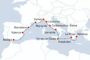Grèce, Espagne, France, Italie Itinéraire: Le Piree - Athenes , Katakolon , Malaga - Corfu , Syracuse (Sicile) , Sorrente , Civitavecchia - Rome , Livourne , Genes , Marseille , Barcelone , Valence , Malaga Pension Complète Vasco da Gama 14 jours Cabine standard Le Piree - Athenes 04/04/2026 dès 2599 CHF All inclusive disponible Pension Complète Voir les offres