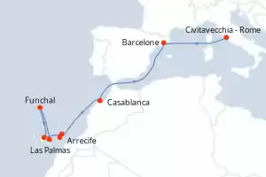 Italie, Espagne, Maroc, Portugal Itinéraire: Las Palmas , Funchal , Santa Cruz de Tenerife , Arrecife , Puerto del Rosario , Casablanca , Barcelone , Civitavecchia - Rome Pension Complète MSC Musica 11 jours Cabine balcon Las Palmas 10/04/2026 dès 1320 CHF Internet à bord Clubs Enfants dès 3 ans Enfants Gratuits jusqu'à 12 ans Pension Complète Voir les offres