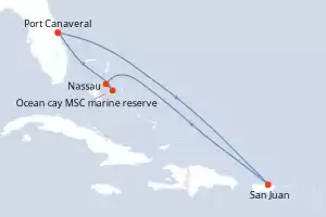 États-Unis, Bahamas, Porto Rico Itinéraire: Port Canaveral , San Juan , Nassau , Ocean cay MSC marine reserve , Port Canaveral Pension Complète MSC Seashore 8 jours Suite Port Canaveral 23/11/2025 dès 3119 CHF + dès 4639 CHF Formule all inclusive Service de majordome dédié Forfait Internet Browse inclus Accès gratuit à l’espace thermal du MSC Aurea Spa Pension Complète Voir les offres