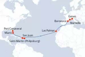 États-Unis, Porto Rico, Pays-Bas, Espagne, France, Italie Itinéraire: Genes , Marseille , Barcelone , Las Palmas , Saint-Martin (Philipsburg) , San Juan , Miami , Port Canaveral Pension Complète MSC Grandiosa 18 jours Suite Genes 19/11/2025 dès 5536 CHF Formule all inclusive Service de majordome dédié Forfait Internet Browse inclus Accès gratuit à l’espace thermal du MSC Aurea Spa Pension Complète Voir les offres