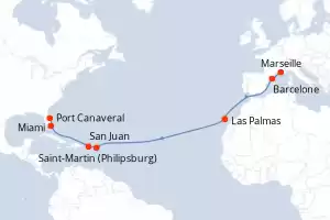 Espagne, France, États-Unis, Porto Rico, Pays-Bas Itinéraire: Marseille , Barcelone , Las Palmas , Saint-Martin (Philipsburg) , San Juan , Miami , Port Canaveral Pension Complète MSC Grandiosa 17 jours Suite Marseille 20/11/2025 dès 5041 CHF + dès 5817 CHF Formule all inclusive Service de majordome dédié Forfait Internet Browse inclus Accès gratuit à l’espace thermal du MSC Aurea Spa Pension Complète Voir les offres