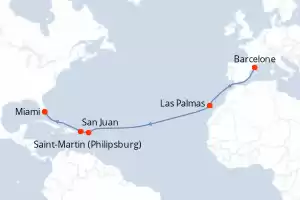 États-Unis, Porto Rico, Pays-Bas, Espagne Itinéraire: Barcelone , Las Palmas , Saint-Martin (Philipsburg) , San Juan , Miami Pension Complète MSC Grandiosa 15 jours Suite Barcelone 21/11/2025 dès 4559 CHF Formule all inclusive Service de majordome dédié Forfait Internet Browse inclus Accès gratuit à l’espace thermal du MSC Aurea Spa Pension Complète Voir les offres