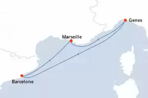 Espagne, Italie, France Itinéraire: Barcelone , Marseille , Genes , Barcelone Pension Complète MSC Seaview 5 jours Suite Barcelone 26/04/2026 dès 1889 CHF + dès 2308 CHF Formule all inclusive Service de majordome dédié Forfait Internet Browse inclus Accès gratuit à l’espace thermal du MSC Aurea Spa Pension Complète Autres ports d'embarquement : Marseille Genes Voir les offres