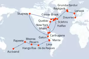 Royaume-Uni,Islande,Canada,États-Unis,Colombie,Panama,Équateur,Pérou,Chili,France,Nouvelle-Zélande Itinéraire: Douvres , Lerwick , Reykjavik , Grundarfjordur , Isafjordhur , St Johns CA , Corner Brook , Quebec , Quebec , Skagway , Charlottetown , Sydney CA , Halifax , New York , New York , Miami , Carthagene CO , Gatun , Manta , Lima , Lima , Pisco , Hango Roa - Ile de Paques , Pitcairn , Papeete , Moorea , Auckland Pension Complète Crown Princess 57 jours Cabine standard Douvres 04/07/2026 dès 7738 CHF Croisière Premium Cuisine raffinée Service personalisé Pension Complète Voir les offres