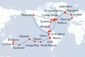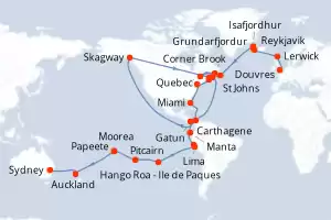 Royaume-Uni,Islande,Canada,États-Unis,Colombie,Panama,Équateur,Pérou,Chili,France,Nouvelle-Zélande,Australie Itinéraire: Douvres , Lerwick , Reykjavik , Grundarfjordur , Isafjordhur , St Johns CA , Corner Brook , Quebec , Quebec , Skagway , Charlottetown , Sydney CA , Halifax , New York , New York , Miami , Carthagene CO , Gatun , Manta , Lima , Lima , Pisco , Hango Roa - Ile de Paques , Pitcairn , Papeete , Moorea , Auckland , Sydney Pension Complète Crown Princess 61 jours Cabine standard Douvres 04/07/2026 dès 8113 CHF Croisière Premium Cuisine raffinée Service personalisé Pension Complète Voir les offres