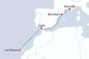 France, Espagne, Canaries Itinéraire: Marseille , Barcelone , Cadix , Las Palmas Pension Complète Costa Fortuna 6 jours Cabine standard Marseille 14/12/2025 dès 125 CHF Enfants Gratuits jusqu'à 18 ans Club Enfants dès 3 ans Pension Complète Voir les offres