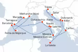 Italie, Grèce, Croatie, Monténégro Itinéraire: Civitavecchia - Rome , Split , Kotor , Dubrovnik , Corfou , Naples , Civitavecchia - Rome Pension Complète Legend 10 jours Cabine standard Civitavecchia - Rome 02/10/2026 dès 1000 CHF Clubs enfants dès 2 ans Activités à bord incluses Pension Complète Voir les offres
